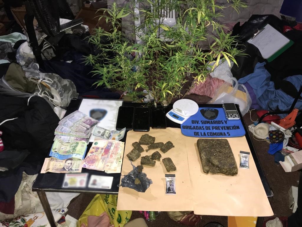 En el procedimiento, los oficiales hallaron un pan de marihuana de 875 gramos y otros trozos de la misma sustancia, que sumaban un kilogramo de la droga, tres teléfonos celulares, dinero en efectivo en pesos, argentinos y uruguayos, y dólares, y dos balanzas de precisión. También, los efectivos encontraron plantas de marihuana en canteros.