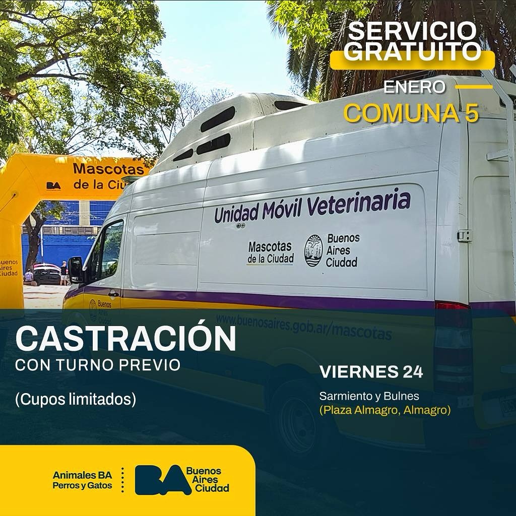 El viernes 24 de enero, la Comuna 5 ofrecerá una jornada de castraciones gratuitas para perros y gatos en la Plaza Almagro, ubicada en Sarmiento y Bulnes.
