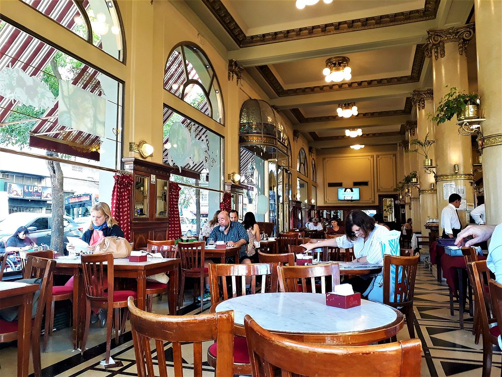 Inaugurada en 1884, Las Violetas fue concebida como un proyecto ambicioso de los inmigrantes Felman y Rodríguez Acal, que no escatimaron en detalles ni recursos para dotar a su confitería de una atmósfera única. La arquitectura del local es una verdadera obra de arte: columnas de mármol italiano, boiseries finamente talladas, magníficos vitraux de colores que llenan de luz sus amplios salones y muebles traídos directamente desde París, que le confieren ese aire señorial y clásico que la hace inconfundible. No es casual que grandes figuras como la poetisa Alfonsina Storni, vecina del barrio, o el escritor Roberto Arlt fueran asiduos visitantes de sus mesas.